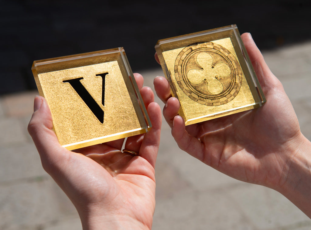 Stefania Dei Rossi propone diverse collezioni di press papier, tutte riunite sotto il nome evocativo di "Otto per Otto". Questo manufatto prende il nome dalle dimensioni della foglia d’oro zecchino, tradizionalmente prodotta nel formato di 8 per 8 centimetri.