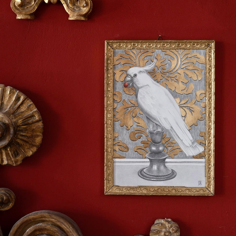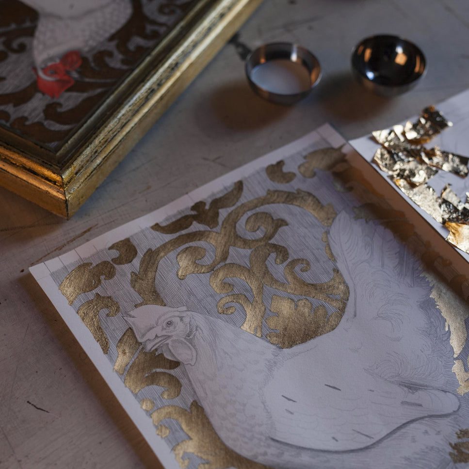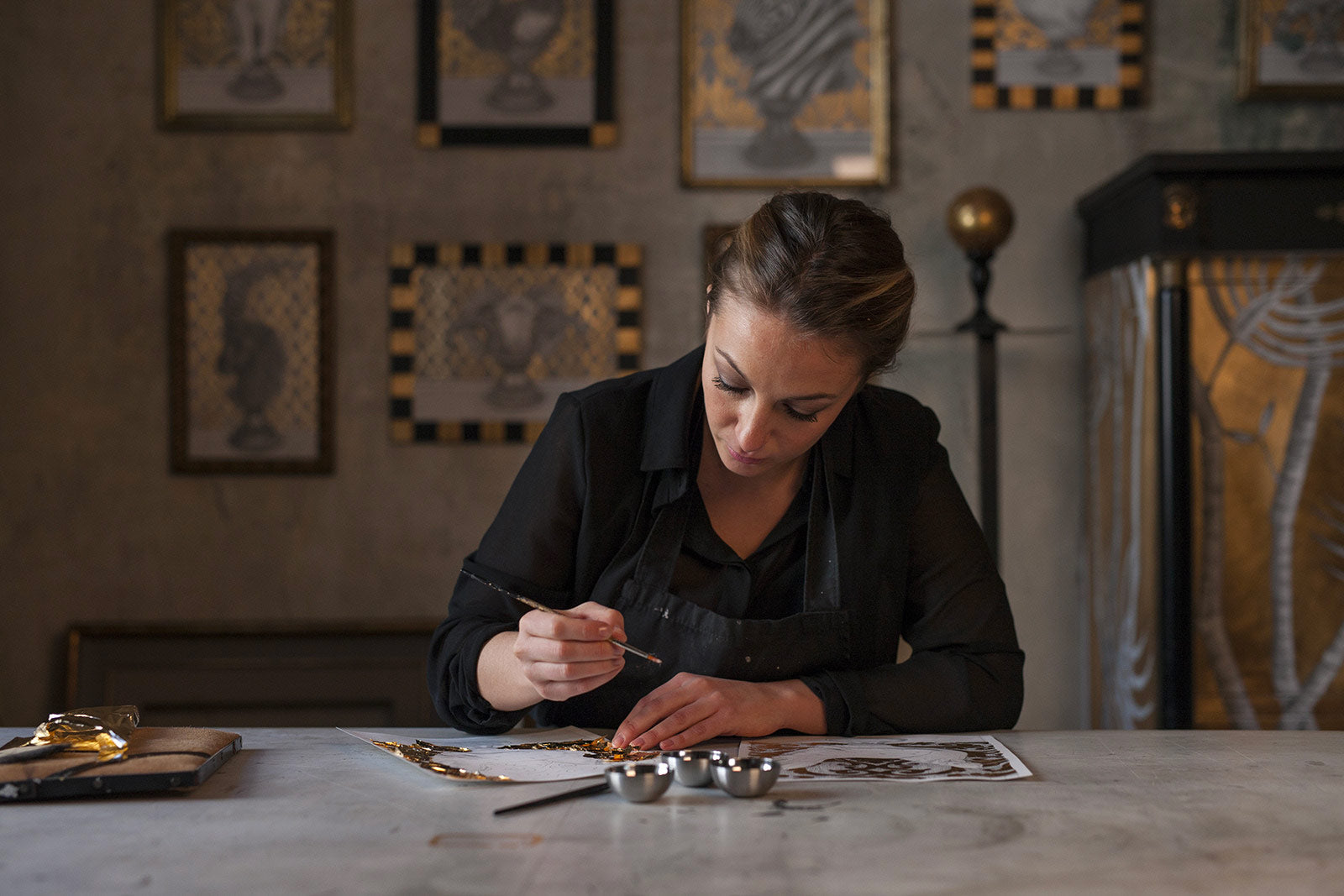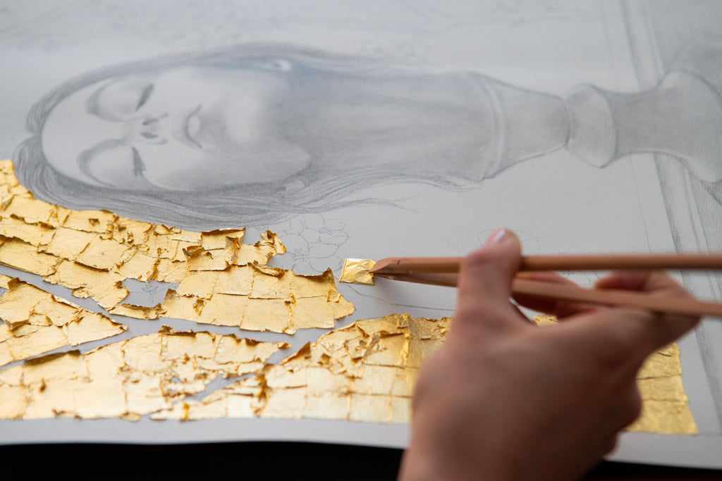 La tecnica impiegata nei disegni, da cui prendono vita anche le varie collezioni di complementi d’arredo, è grafite e foglia oro su carta. La grafite, materiale umile e semplice, si contrappone alla preziosità della foglia oro, creando un contrasto non solo a livello cromatico ma che abbraccia una dimensione ideale.Questo connubio tra elementi così diversi dà vita a opere che sono al contempo intime e universali, generando un dialogo visivo che evoca una dimensione onirica.