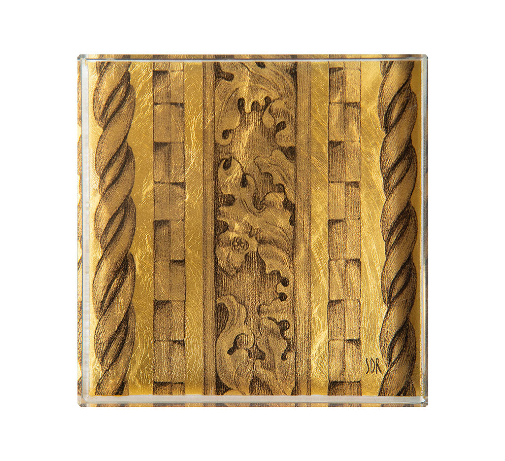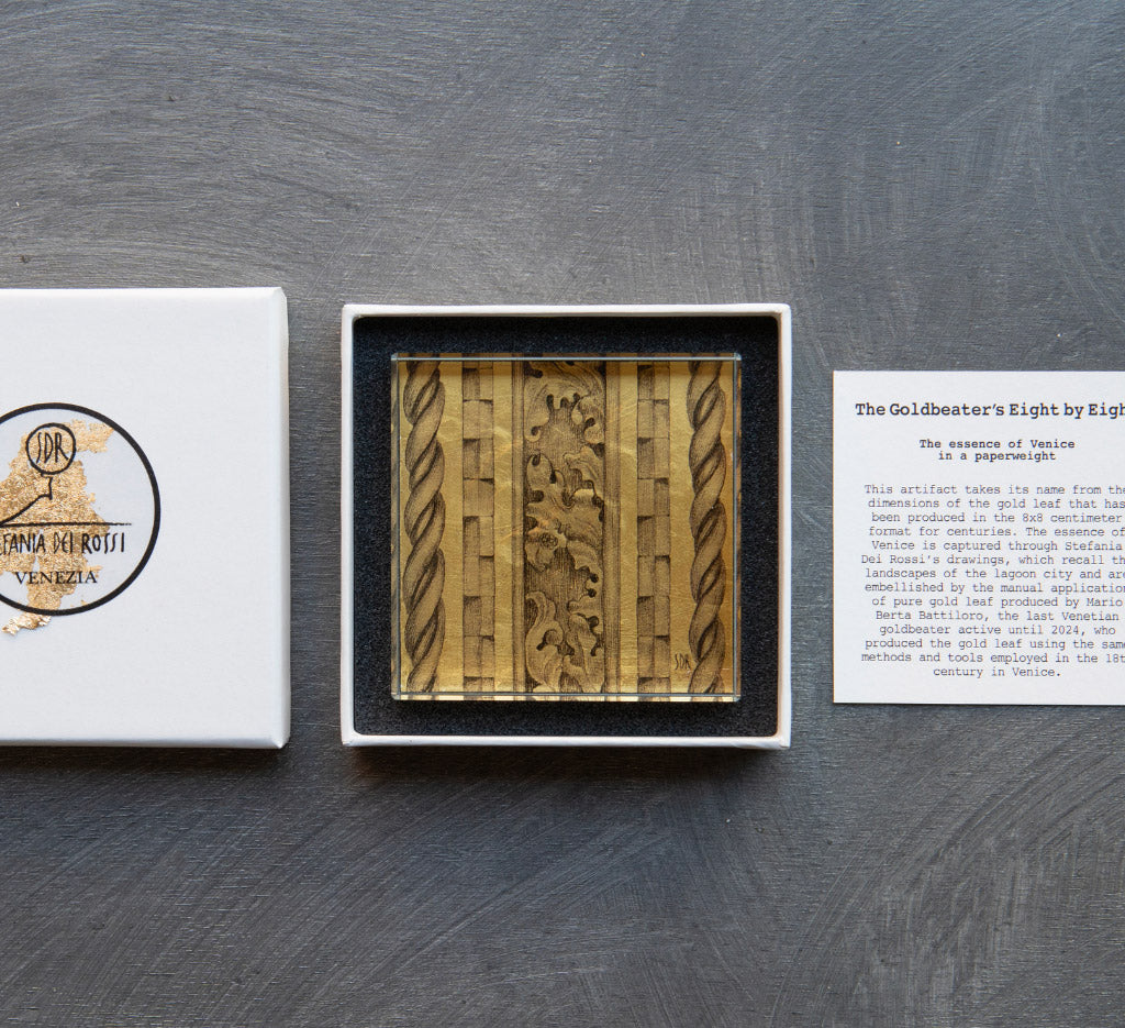 L’essenza di Venezia viene rappresentata nei disegni di Stefania Dei Rossi che catturano il ricordo dei paesaggi della città lagunare e vengono impreziositi dall’applicazione manuale della foglia oro puro prodotta da Mario Berta Battiloro, l’ultimo Maestro artigiano d’Europa produttore di foglia oro rimasto attivo fino al 2024.