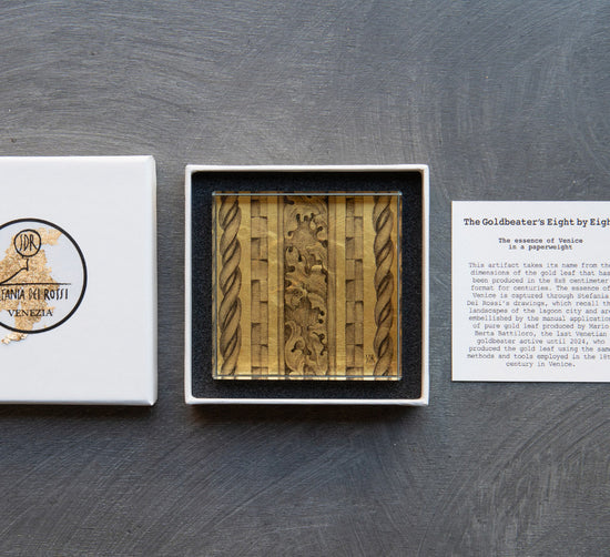 Mario Berta Battiloro è stato l'ultimo maestro artigiano in Europa a produrre foglia d'oro utilizzando le medesime tecniche e strumenti impiegati a Venezia sin dal XVIII secolo. La sua bottega a Venezia è stata un simbolo della più pura tradizione orafa, e la sua produzione di foglia d’oro, impiegata nella collezione "Otto per Otto del Battiloro", conferisce ai fermacarte un valore inestimabile, legato a un’eredità artigianale che, purtroppo, non avrà continuità.