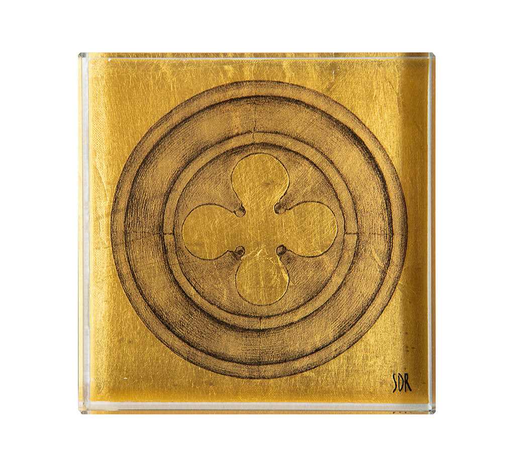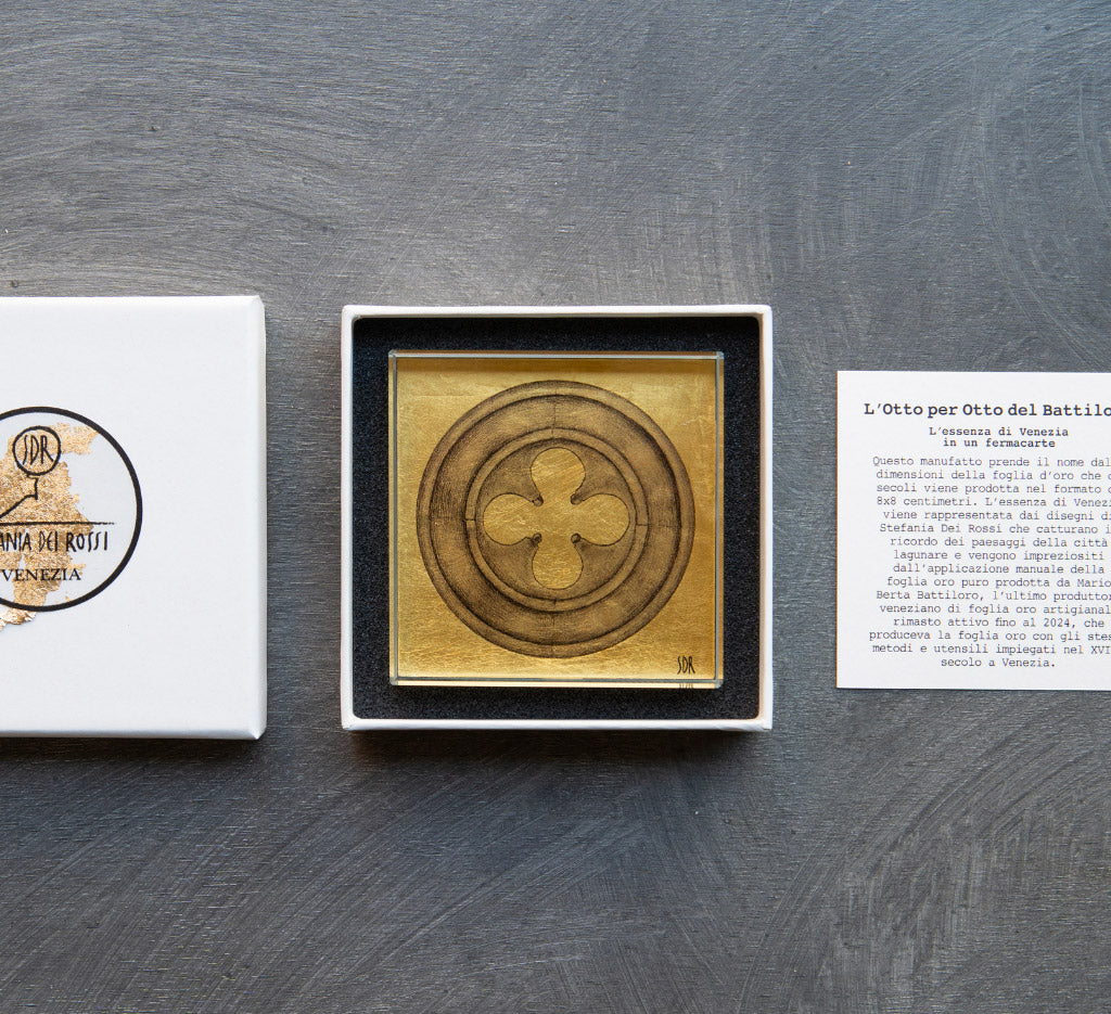 L’essenza di Venezia viene rappresentata nei disegni di Stefania Dei Rossi che catturano il ricordo dei paesaggi della città lagunare e vengono impreziositi dall’applicazione manuale della foglia oro puro prodotta da Mario Berta Battiloro, l’ultimo Maestro artigiano d’Europa produttore di foglia oro rimasto attivo fino al 2024.