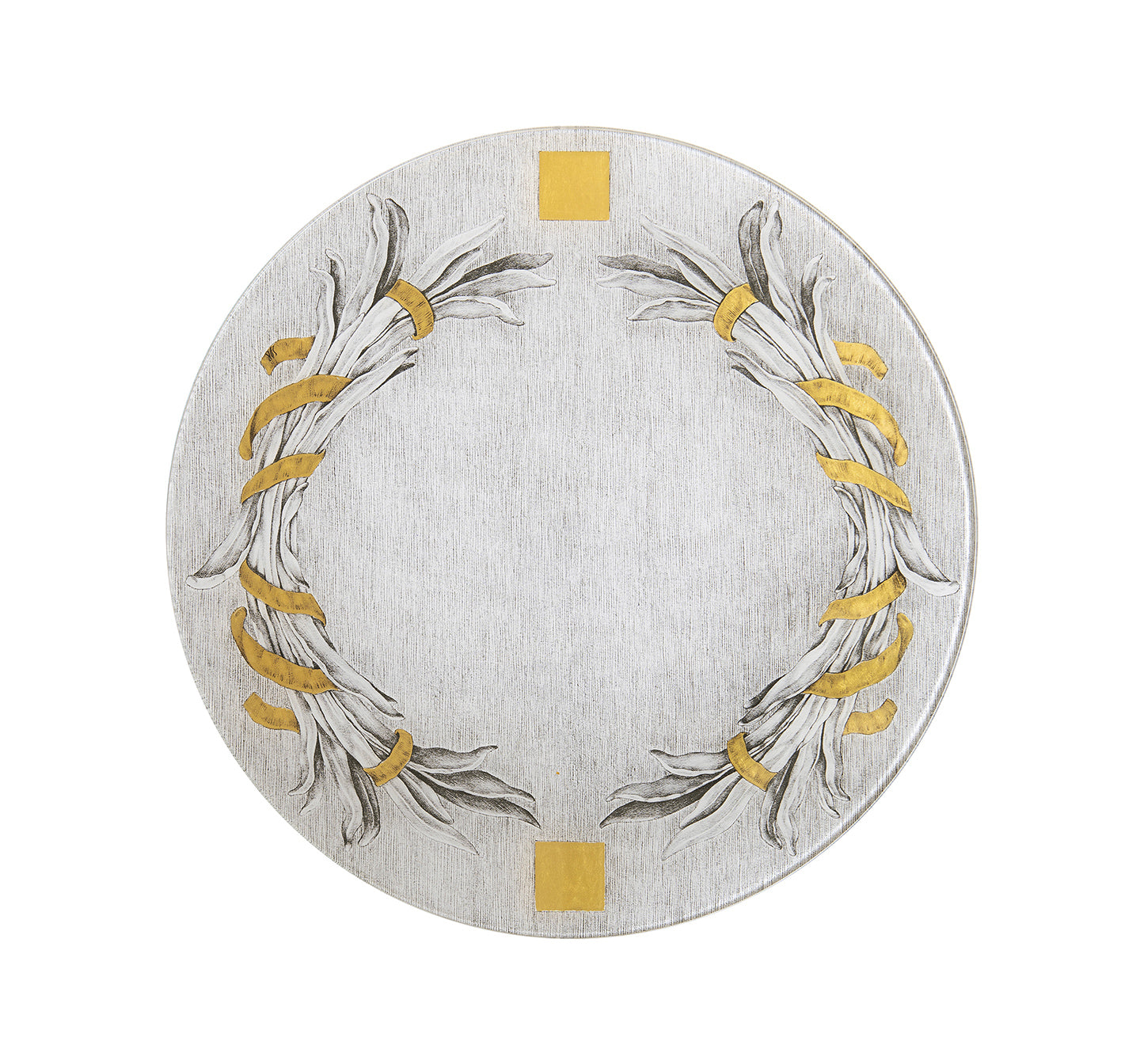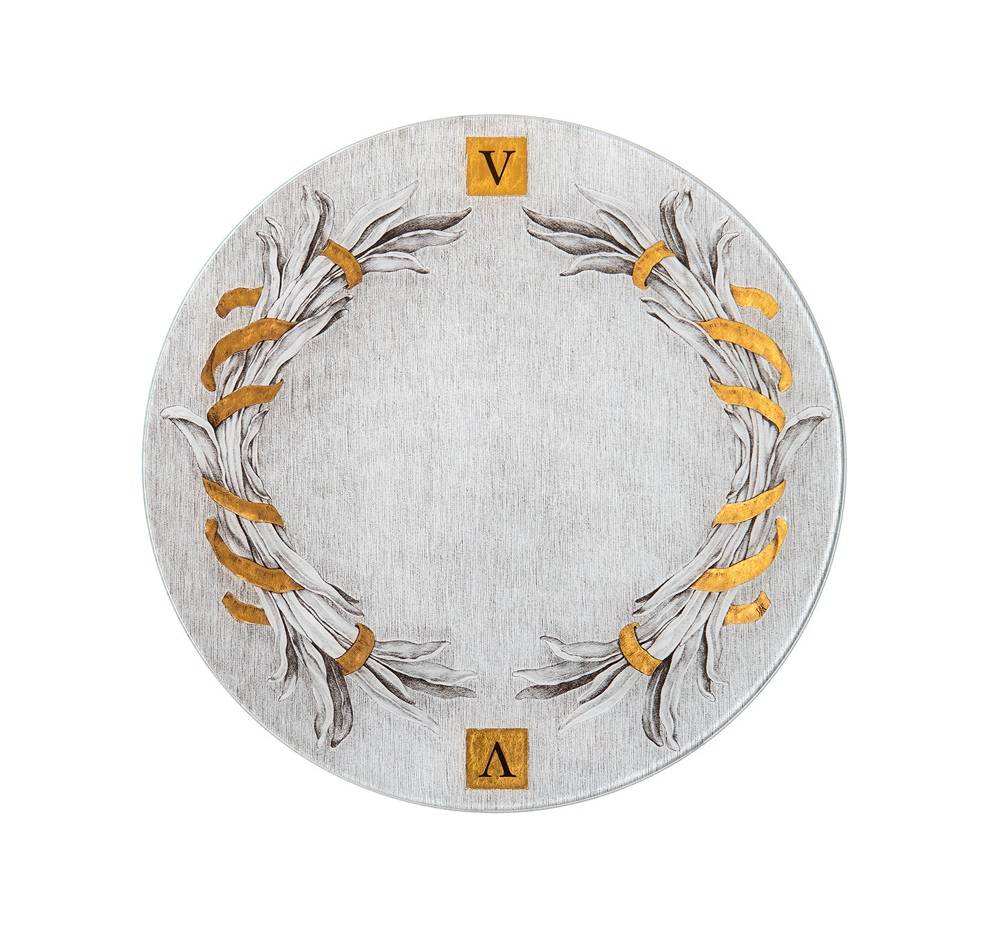 Sottopiatto in vetro temperato con applicazione manuale di foglia oro zecchino.