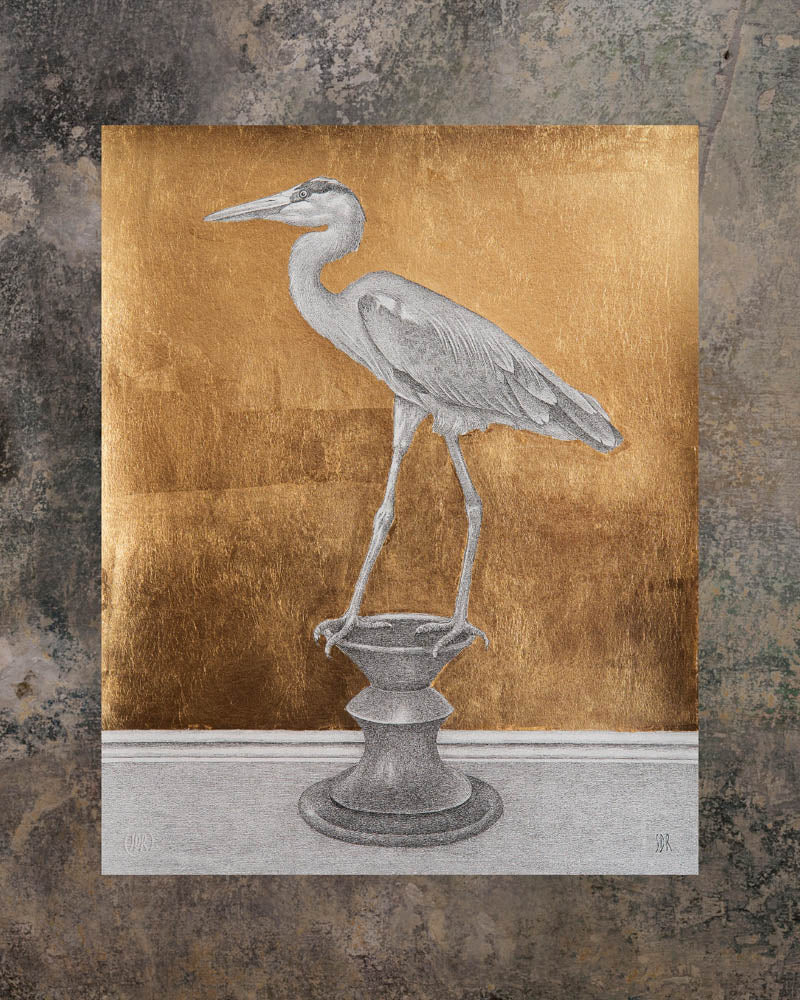 Ho trovato molto interessante l’aver messo su piedistalli animali diversi, anche quelli considerati più umili, come quelli da pollaio. L’oro dello sfondo rafforza la preziosità offerta agli animali. Sul muro di casa un effetto prezioso, raffinato, ma anche divertentemente scanzonato. Un gran bell’effetto!