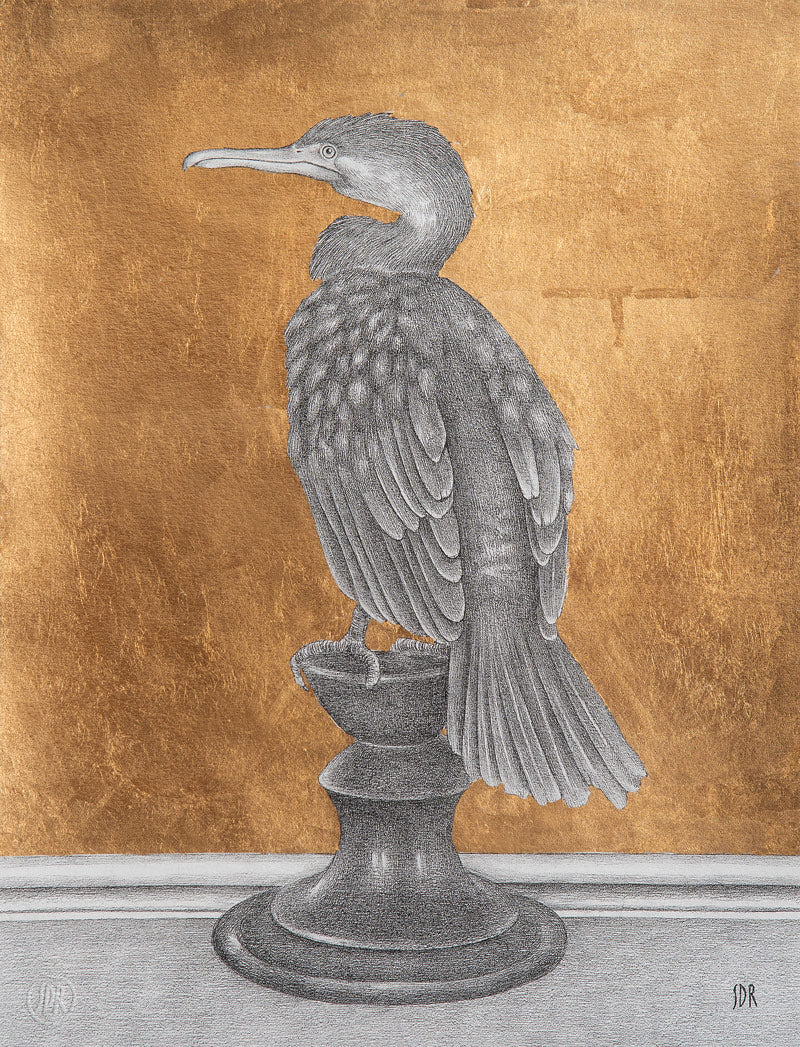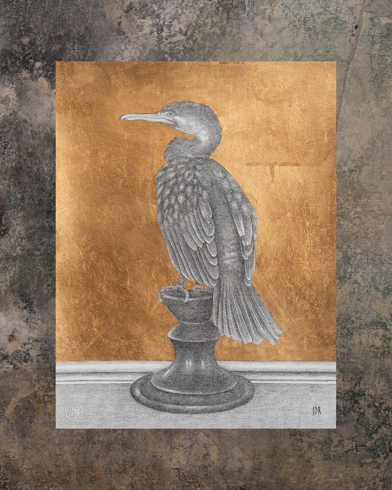 Ho trovato molto interessante l’aver messo su piedistalli animali diversi, anche quelli considerati più umili, come quelli da pollaio. L’oro dello sfondo rafforza la preziosità offerta agli animali. Sul muro di casa un effetto prezioso, raffinato, ma anche divertentemente scanzonato. Un gran bell’effetto!
