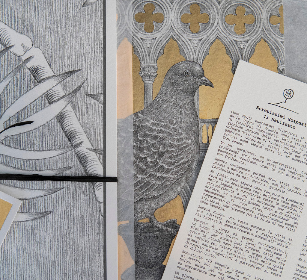 Ogni soggetto della collezione Serenissimi Sospesi è accompagnato dal Manifesto della serie, un testo in cui l'artista condivide le sue riflessioni sulla città di Venezia, un luogo unico e affascinante, intriso di storia e contraddizioni. Questo manifesto arricchisce ulteriormente le stampe, offrendo al collezionista una prospettiva più intima e personale sul legame tra i soggetti raffigurati e la città che li ispira.